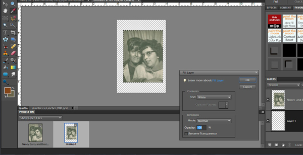 First step: Open a new file larger than your photo, with a transparent background. Plop your photo onto this background layer. In your layers palette, highlight your background layer.